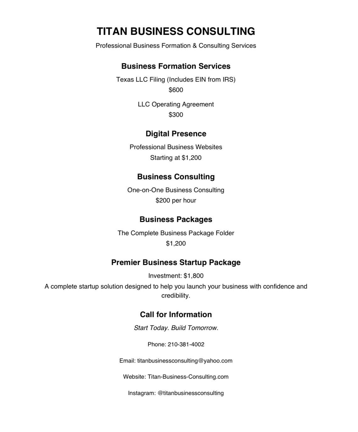 While being a business owner requires hard work and dedication, the results are always worth it.That passion led me to create Titan Business Consulting - a company dedicated to consulting clients develop simple, clear, and effective plans for starting their businesses. Every successful venture begins with a strong foundation, and our mission is to help clients build exactly that. We specialize in guiding new entrepreneurs through the early stages of business development, breaking down complex processes into an easy-to-follow, step-by-step approach.At Titan Business Consulting, we turn ideas into actionable plans - helping our clients achieve real results and move forward with confidence.